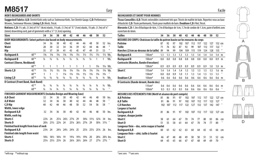 Rashguards with short or long raglan sleeves, neckband, and narrow hems. View B has contrast sleeves and neckband. Shorts in two lengths have elastic waistband with drawstring and grommets. View D has contrast lower front and back.