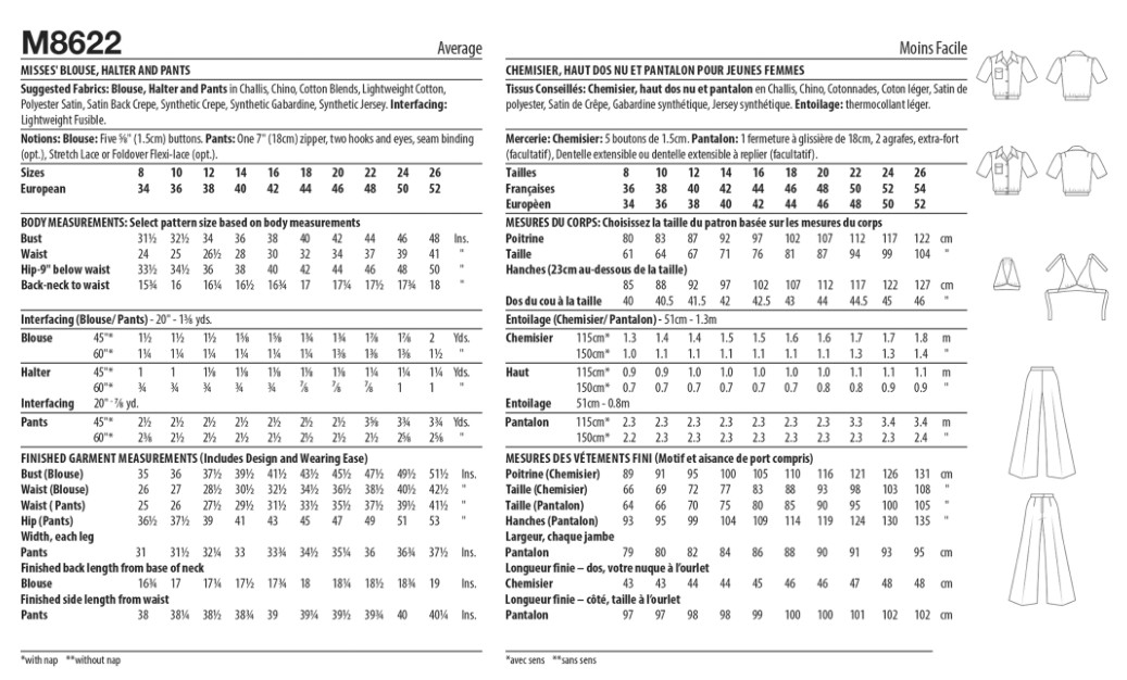 Blouse, Halter and Pants in Challis, Chino, Cotton Blends, Lightweight Cotton, Polyester Satin, Satin Back Crepe, Synthetic Crepe, Synthetic Gabardine, Synthetic Jersey. Interfacing: Lightweight Fusible.