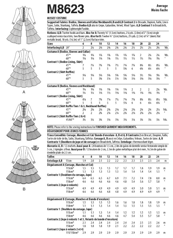 Bodice, Sleeves and Collar/Neckband A,B and A,B Contrast 2 in Brocade, Dupioni, Faille, Linen Types, Satin, Shantung, Taffeta. Bodice A,B also in Crepe, Gabardine, Velvet, Wool Types. A,B Contrast 1 in Broadcloth, Taffeta. Interfacing: Lightweight Fusible.