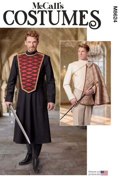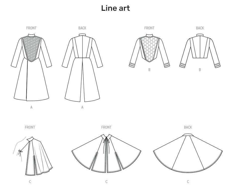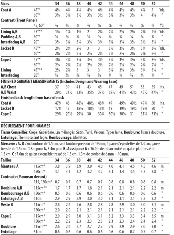 Lined fitted coat and jacket have asymmetrical front buttoned closure, long sleeves, band collar, shoulder pads, braid trim and detachable lightly padded front panel with crisscross trim detail or dragon scale pattern quilting. Coat has A-line lower front and back with split. Semicircular, lined short cape has pointed collar, front arm slits, braid trim and cord front ties; cape can be worn over one or both shoulders. See the envelope for more information.