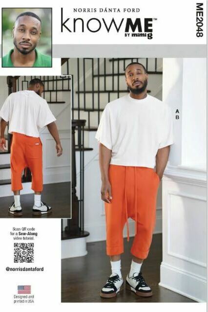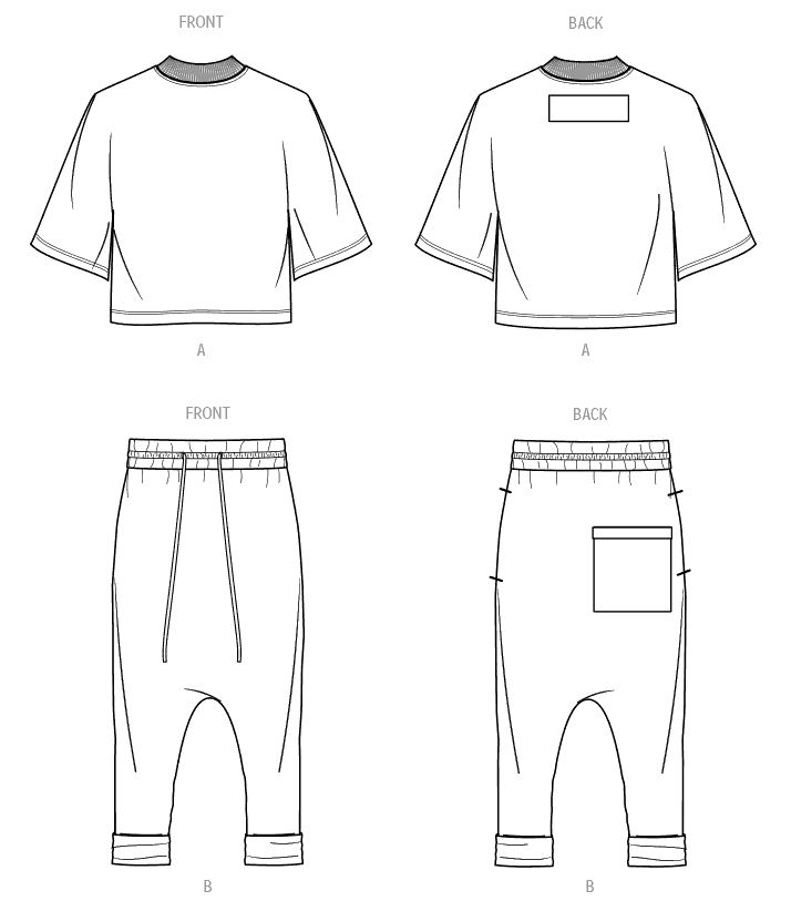 Boxy knit shirt has rib knit neck band, wide kimono style sleeves, self-fabric back patch and hem with double top stitching. Dropped crotch joggers have drawstring ties, side seam pockets, and rolled cuffs.