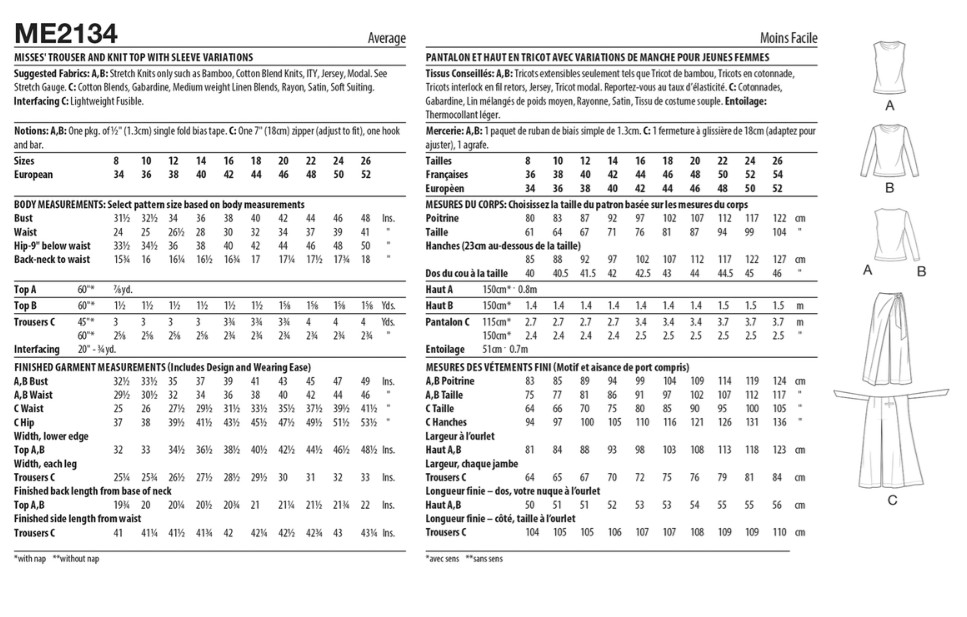 Fabric Suggestions: A,B: Stretch Knits only such as: Bamboo, Cotton Blend Knits, ITY, Jersey, Modal. See Stretch Gauge. C: Cotton Blends, Gabardine, Medium weight Linen Blends, Rayon, Satin, Soft Suiting. Interfacing C: Lightweight Fusible.