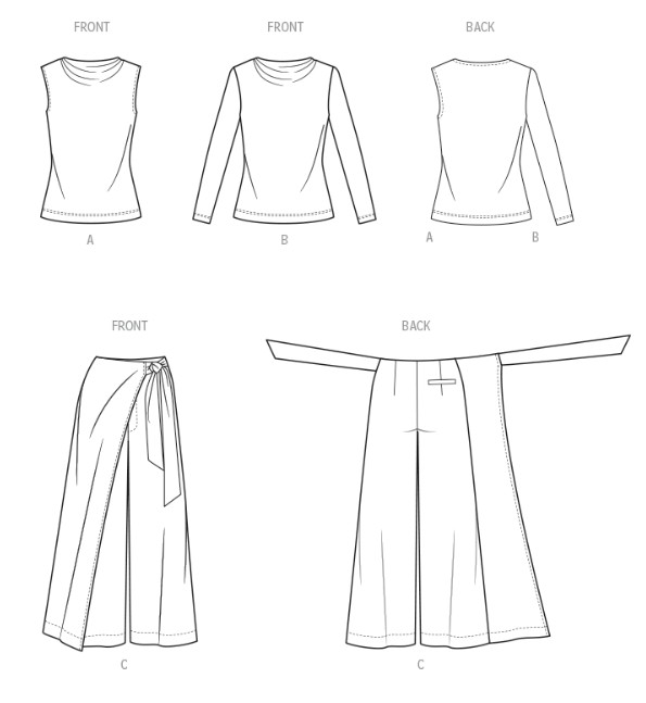 Draped mock neck top pattern has long sleeves and sleeveless option. Wide leg pants have front wrap, tie sash, front fly zipper, hook and bar closure, back darts and back welt pocket.
