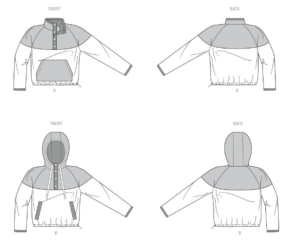 Loose- fitting contrast jacket patterns have front half button opening, curved yoke, front kangaroo or welt pockets, raglan sleeves, and elastic cord at the waist. View B jacket has hood with ties.