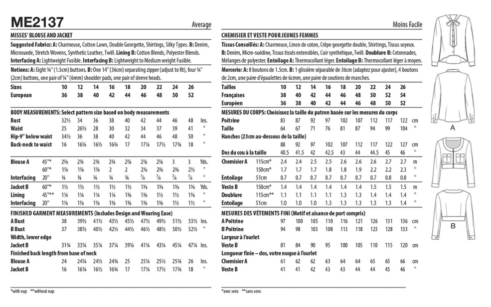 Fabric Suggestions: A: Charmeuse, Cotton Lawn, Double Georgette, Shirtings, Silky Types. B: Denim, Microsuede, Stretch Wovens, Synthetic Leather, Twill. Lining B: Cotton Blends, Polyester Blends. Interfacing A: Lightweight Fusible. Interfacing B: Lightweight to Medium weight Fusible.