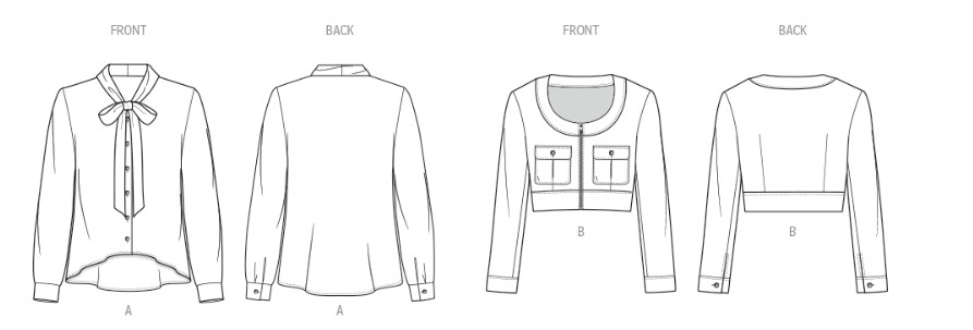V-neck button down blouse pattern has tie at neckline, long sleeves with button cuffs and hi-lo hem. Cropped jacket pattern with scoop neckline has front zipper opening, shoulder pads, neckband, waistband, sleeve bands and bellow patch pockets with pleats.