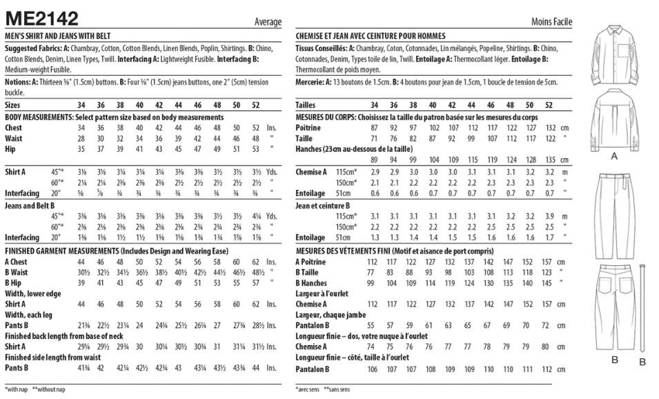 Fabric Suggestions: A: Chambray, Cotton, Cotton Blends, Linen Blends, Poplin, Shirtings. B: Chino, Cotton Blends, Denim, Linen Types, Twill. Interfacing A: Lightweight Fusible. Interfacing B: Medium-weight Fusible.