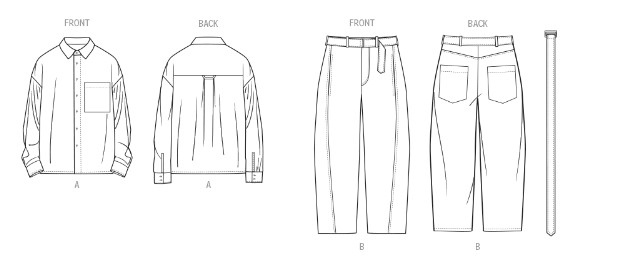 Baggy button up shirt sewing pattern has collar, dropped shoulders, long sleeves with button cuffs, front chest pocket, and back yoke with box pleat and loop. Jeans with matching belt have waistband, belt loops, button-up fly, shaped front seams, front seam pockets and back pockets.