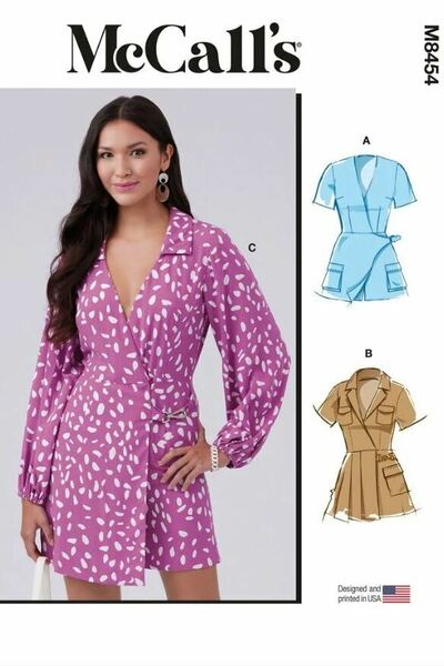 Wrap front romper with sleeve, collar and pocket variations has shorts with hidden front zipper and option of three skirt styles that wrap in front.