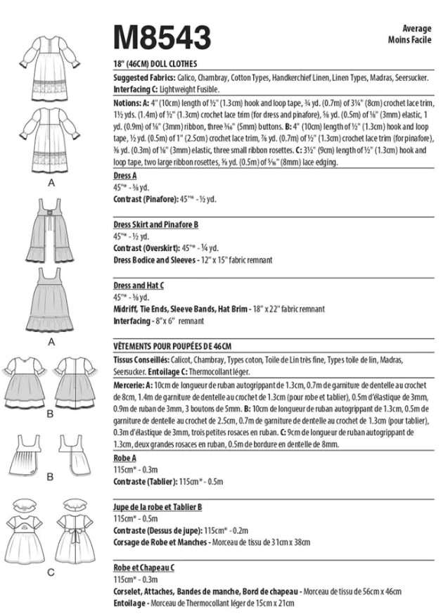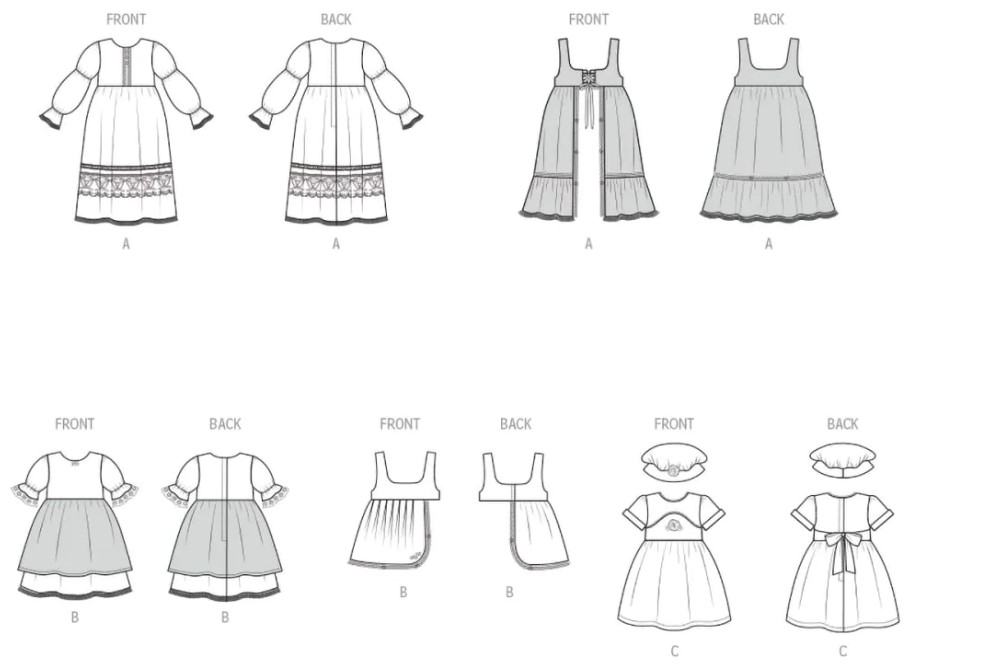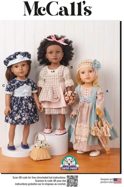 Cottage core dresses for 18" dolls have raised waistline seams, back hook and loop closure, gathered skirts and lightly puffed sleeves. Long dress lace trim and double puffed elasticized long sleeves is worn with open-front pinafore with front lacing. Short dress worn with matching asymmetrical pinafore has contrast bodice and short sleeves and contrast overskirt. Short dress with contrast midriff, tie ends and sleeve bands has matching hat and ribbon rosettes. See envelope for more information.