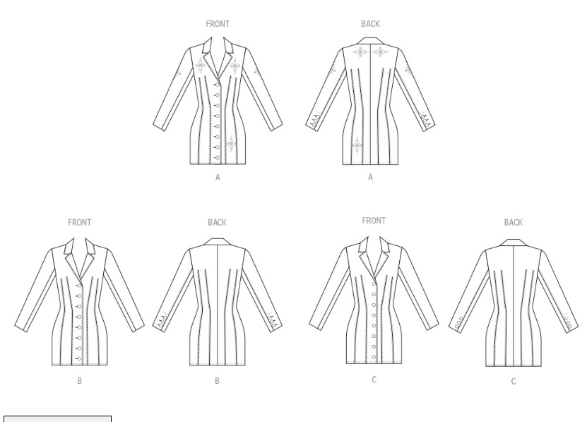 Fitted and lined dress pattern has front and back seam detailing, collar, front button opening, shoulder pads and long sleeves with buttons. View A dress has decorative grommets, rivets and studs.