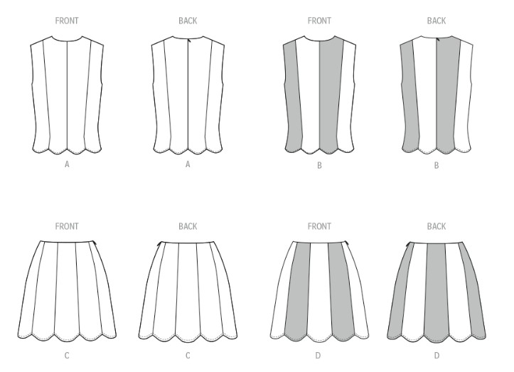 Sleeveless knit top and skirt pattern have scalloped hem and invisible zipper closure. Views B and D have contrast panels.