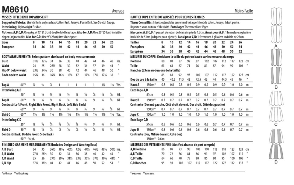 Fabric Suggestions: Stretch Knits only such as Cotton Knit, Jerseys, Ponte Knit. See Stretch Gauge. Interfacing: Lightweight Fusible.