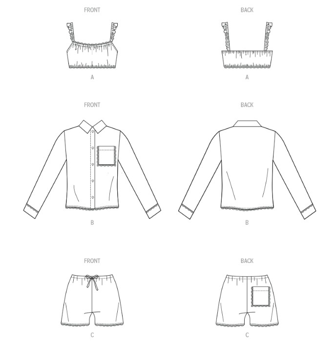 Bralette sewing pattern has ruffle shoulder straps and elastics at neckline and hem. Button front shirt has collar, long sleeves with cuffs and chest pocket. Shorts have elastic at waist and purchased ribbon ties. All views have purchased scalloped eyelet trim.