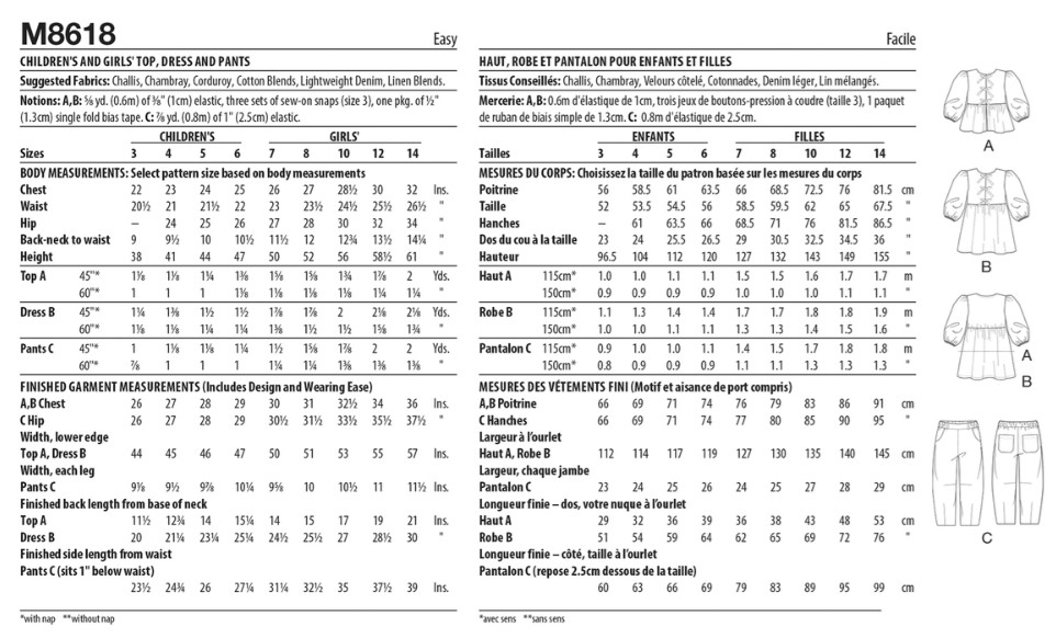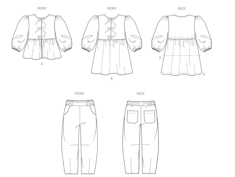 Top and dress sewing patterns have 3/4 puff sleeves with elastic, front ties, purchased sew on snaps and scoop neckline finished with bias tape. Top has peplum hem. Dress has gathers at the waist. Barrel shaped pants have elastic waistband, belt loops, front and back darts and pockets.